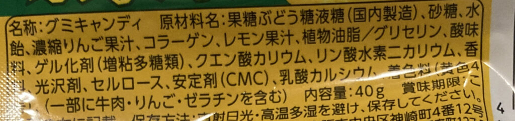 Ingredients: High fructose corn syrup (domestically produced), sugar, starch syrup, concentrated apple juice, collagen, lemon juice, vegetable oil / glycerin, acidulant, gelling agent (thickening polysaccharides), potassium citrate, dipotassium hydrogen phosphate, flavoring, glazing agent, cellulose, stabilizer (CMC), calcium lactate, coloring (Yellow 4, Yellow 5). (Contains beef, apple, and gelatin).
